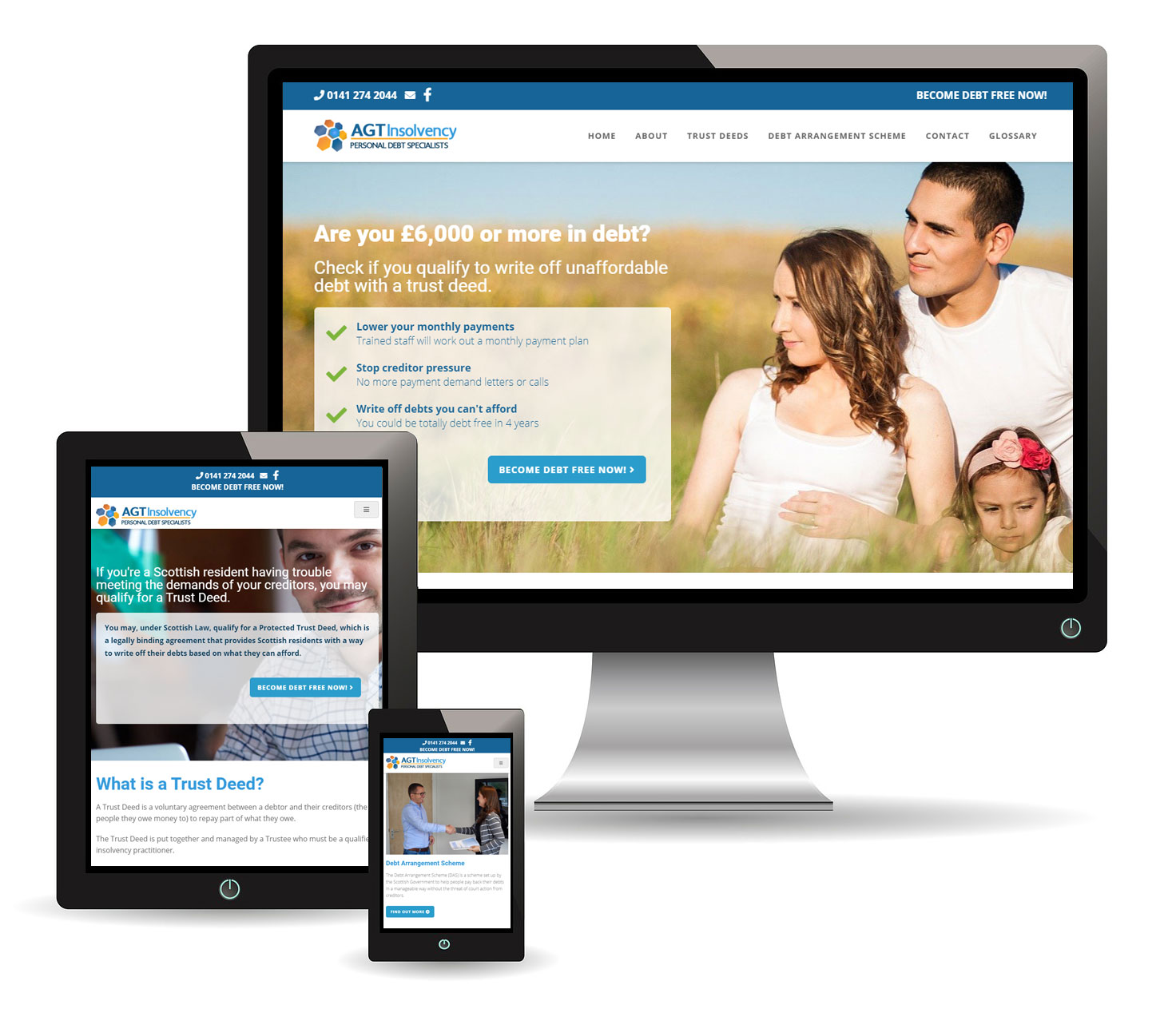Responsive website design for AGT Insolvency, a Scottish owned company operated and based in Glasgow specialising in Protected Scottish Trust Deeds and Debt Arrangement Schemes.