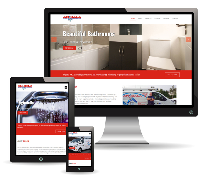 Responsive website design idea for An Cala Heating, Plumbing and Gas Services Ltd who are based in Irvine and cover Ayrshire and surrounding areas.