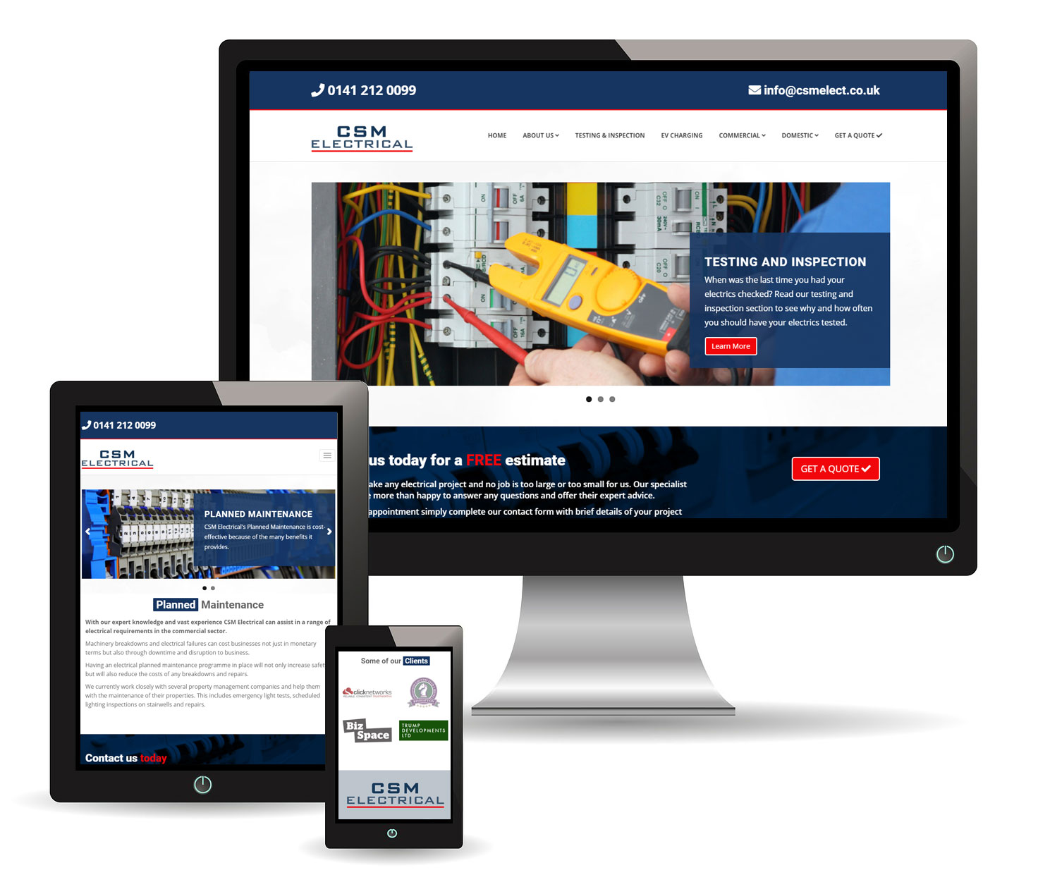 Responsive website redesign for CSM Electrical (A NICEIC Approved Contractor) who carry out a variety of electrical work in the commercial sector: Electrical Testing & Inspection; Thermal Cameras; Planned & Reactive Maintenance and Installations & Fit Outs.