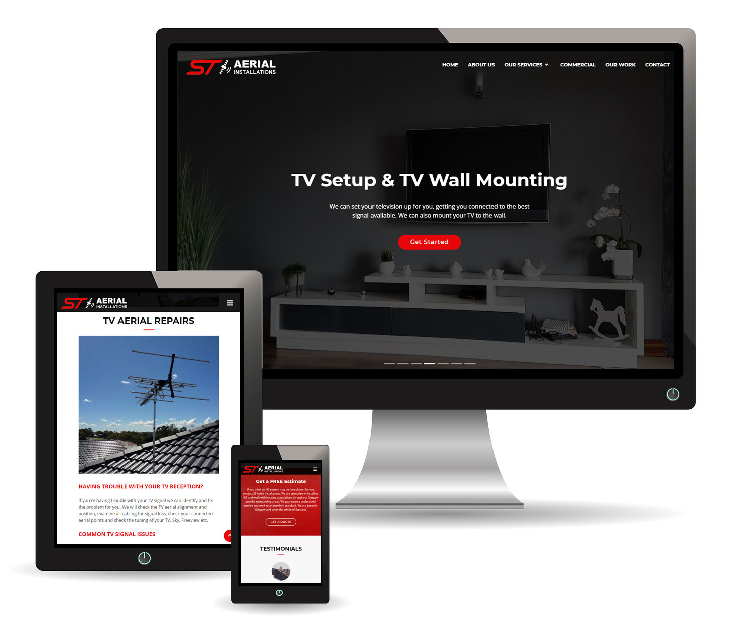 Responsive website redesign for ST Aerial Installations who provide digital TV aerial, satellite and communal IRS installation and repair services in Glasgow and throughout Scotland.