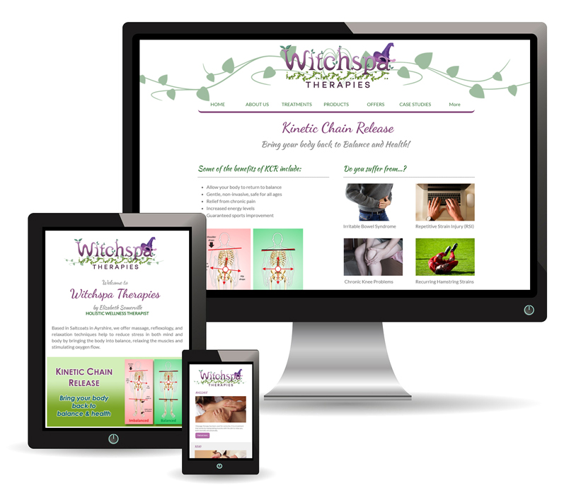 Responsive website design for Witchspa Therapieswho offer massage (from Indian Head massage and back, neck & shoulder, to full body), aromatherapy, reflexology, KCR (Kinetic Chain Release) and Reiki.